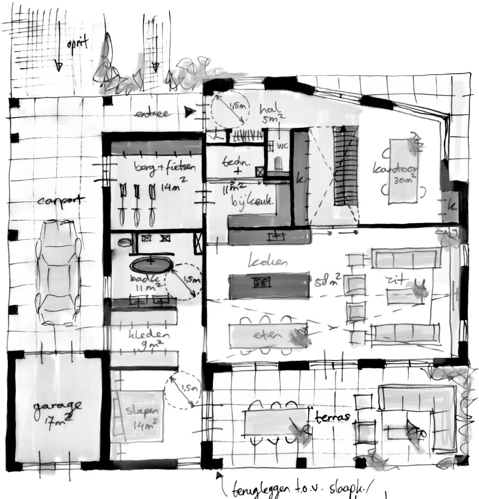 We designed a future proof house, where all program like living, cooking, sleeping and bathing are located on the ground floor. A spacious design with many sightlines.