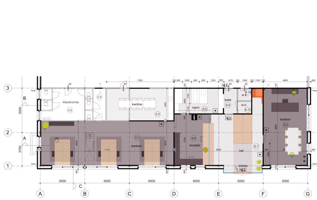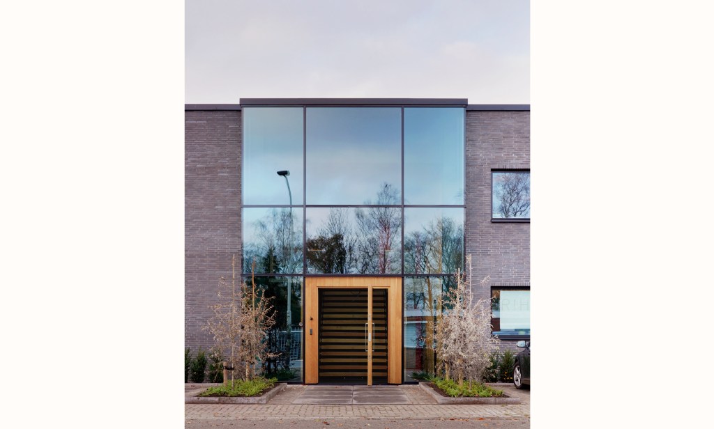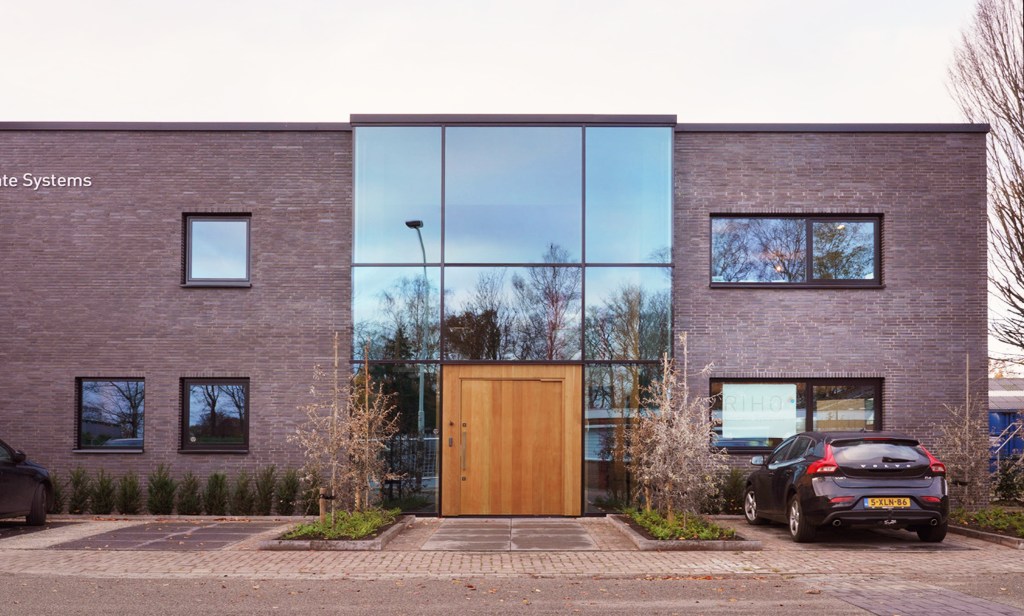 The assignment was to renovate an existing office building. The company is growing, they need more work places and want the building to be representative for its clients. We have designed the entrance with the wooden door and glass facade. For this detail drawing were made and discussed with manufacturers and with the client. Next to this we worked on the interior plan and the colors and materials like dark colors combined with biobased clay plaster for a sustainable and high quality appearance.