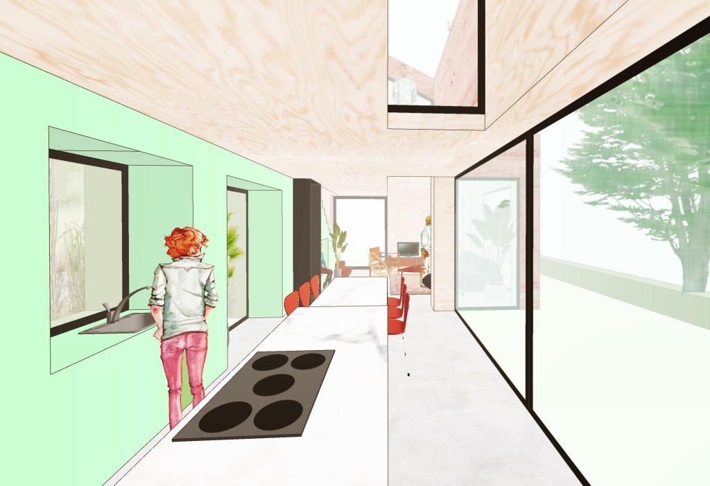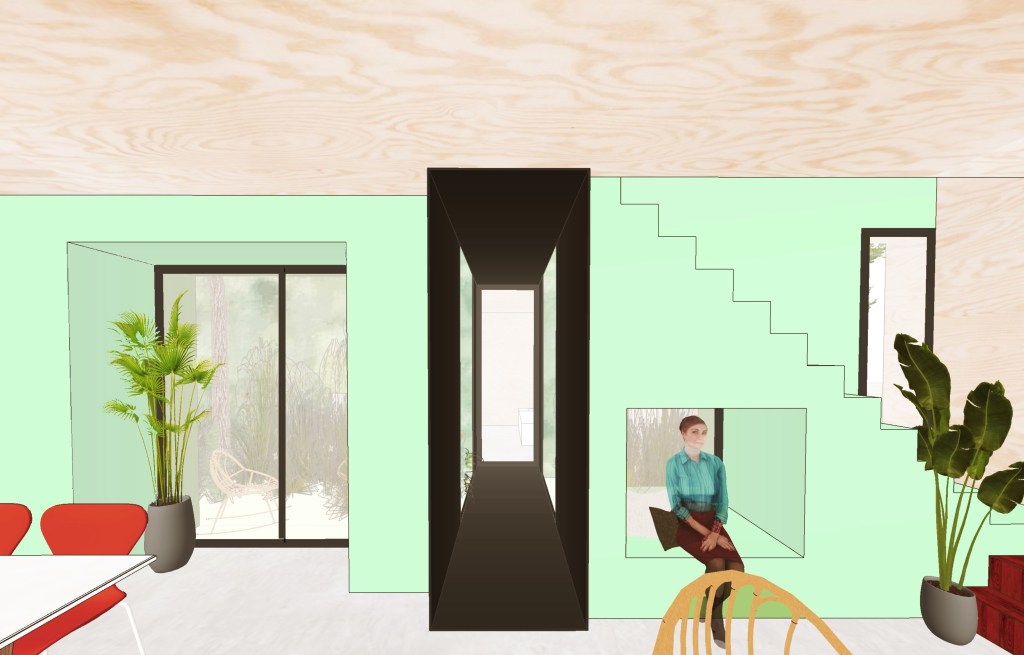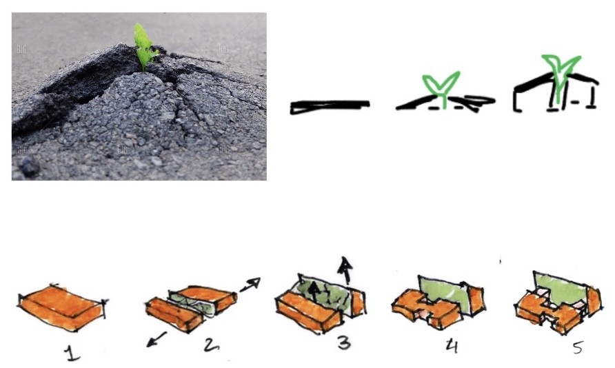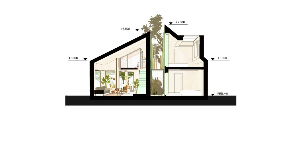 The client is a landscape designer. Therefore it is very important to make a connection between landscape and building (biophilic design). To accomplish this the building has a green patio in the length of the building. It refers to small plants that can grow through asphalt. It shows the power of nature, the plants break the traditional building shape. The patio is like a green connector for the building and will be visible in every space of the house.