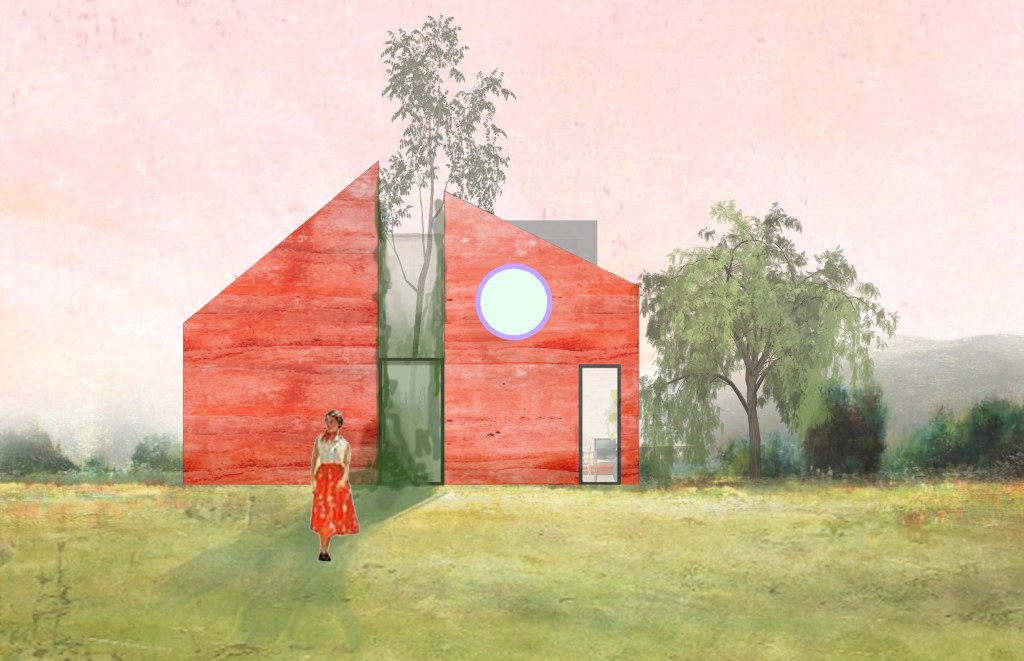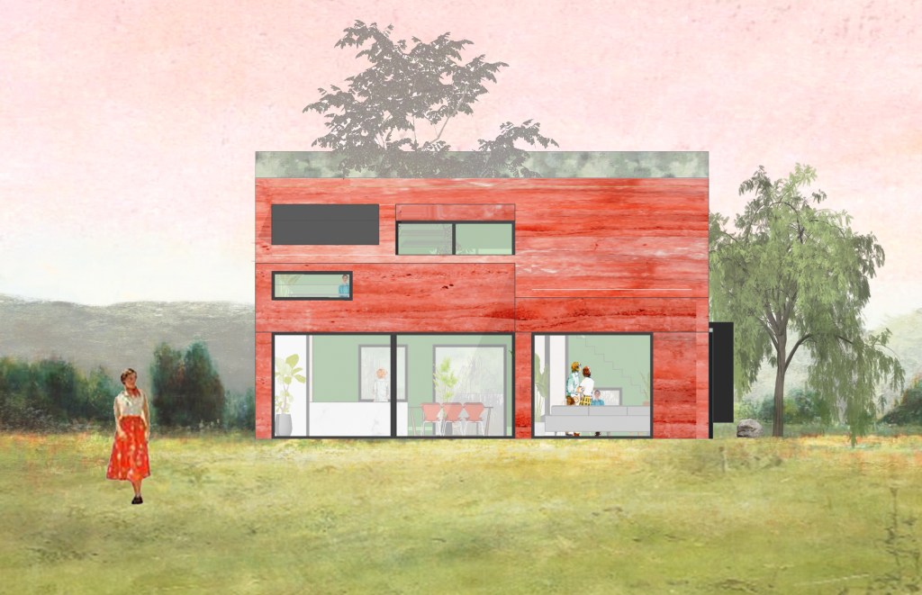The construction is made of CLT, insulated with wood fiber, a green roof and partly green facades (patio facade). The facade will be made of rammed earth in a red/orange color. The patio will be clad with re-used bricks from the shed that is currently located at the site. Different types of bricks can be used for the patio, which gives reliëf that fits well with the concept of nature growing through the building.