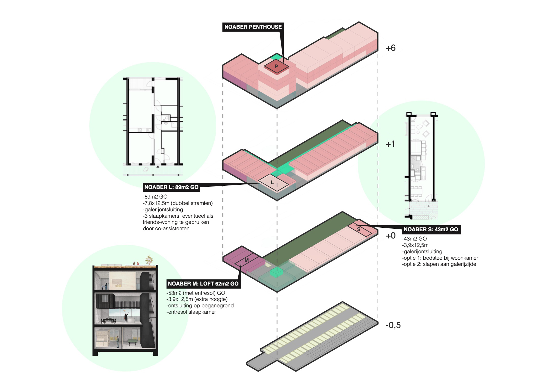 Located at a dynamic urban intersection and connected to the surrounding residential neighbourhood, Noaber forms a distinctive urban landmark. The subdivision of the building volume and the corner tower create a clear identity, while natural and biobased materials such as brick and timber reinforce both the sustainable and social ambitions of the project.