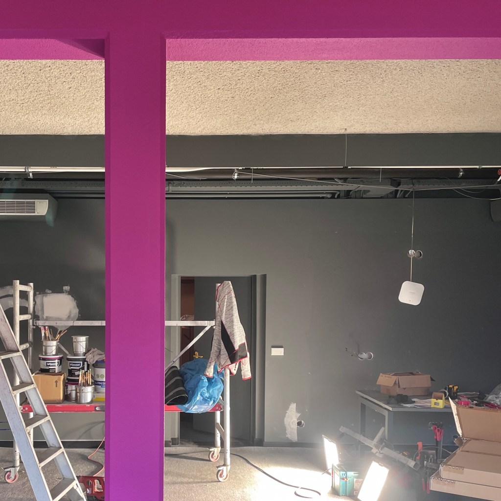 Our interior design for the lunch cafe of area developer VanWonen is currently indet construction. The acoustic ceiling made from recycled cellulose has been completed and new wall installations are now being prepared. The entire build is expected to be completed within just three weeks.